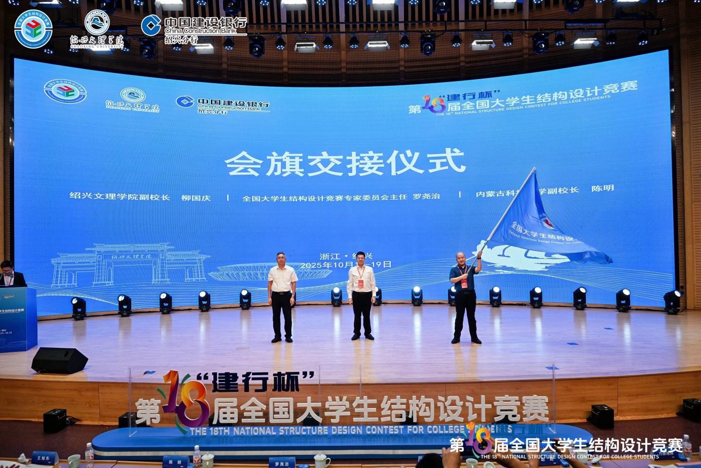 会旗交接仪式上,罗尧治、柳国庆、陈明共同交接。陈明表示,内蒙古科技大学将充分调动学校各方力量,整合资源,竭尽全力做好赛事的各项筹备工作,并诚挚邀请广大师生明年相聚于北方工业重镇包头。