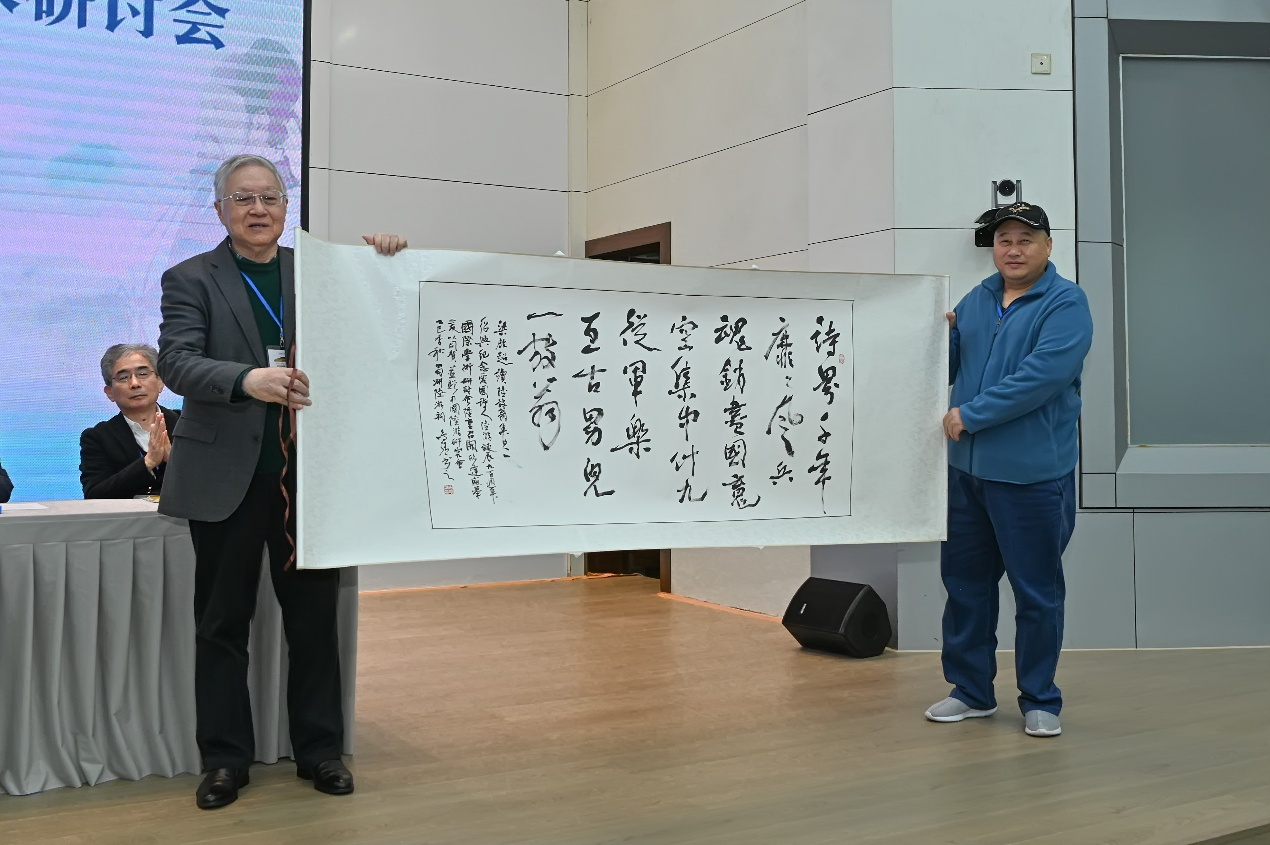 最后,四川崇州全国文保单位“陆游祠”向中国陆游研究会和纪念陆游诞辰900周年国际学术研讨会赠送由陕西理工大学副校长、汉中市青年书法家协会主席严都岿教授创作的书法作品。来自四川崇州的肖岩先生代表上台献礼,中国陆游研究会会长莫砺锋教授接受了书法作品。