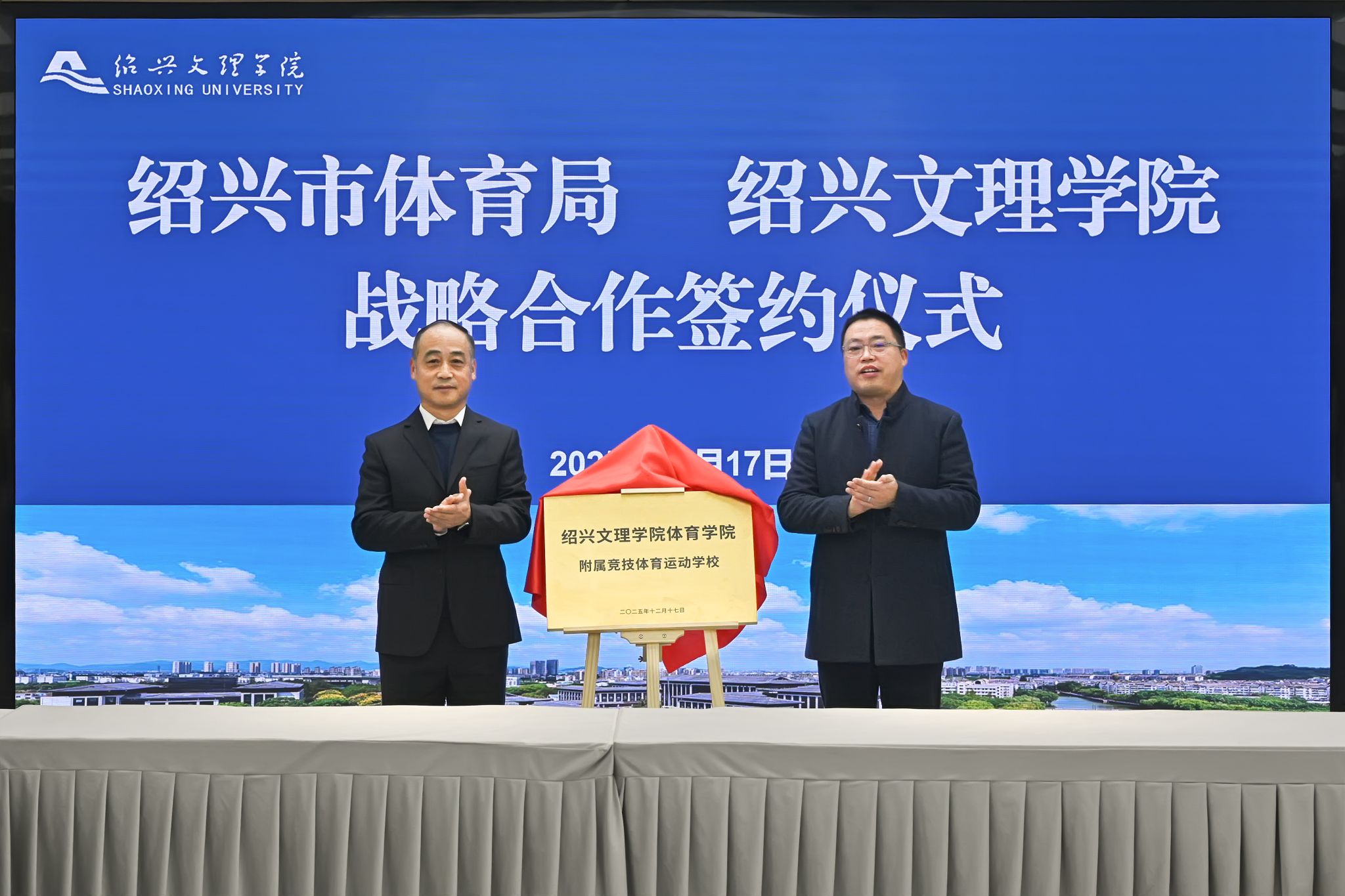 绍兴文理学院体育学院院长周思红、绍兴体育运动学校校长孟建祥为绍兴文理学院体育学院附属竞技体育运动学校揭牌。