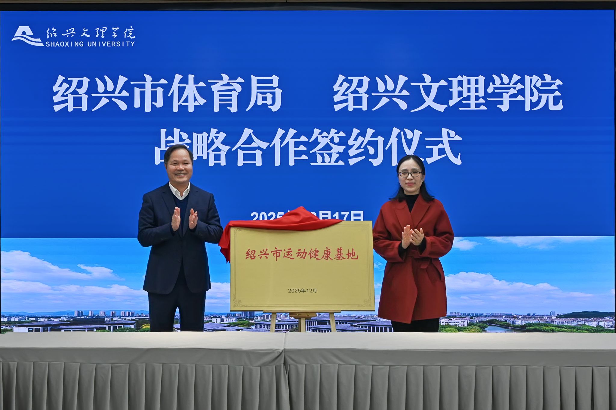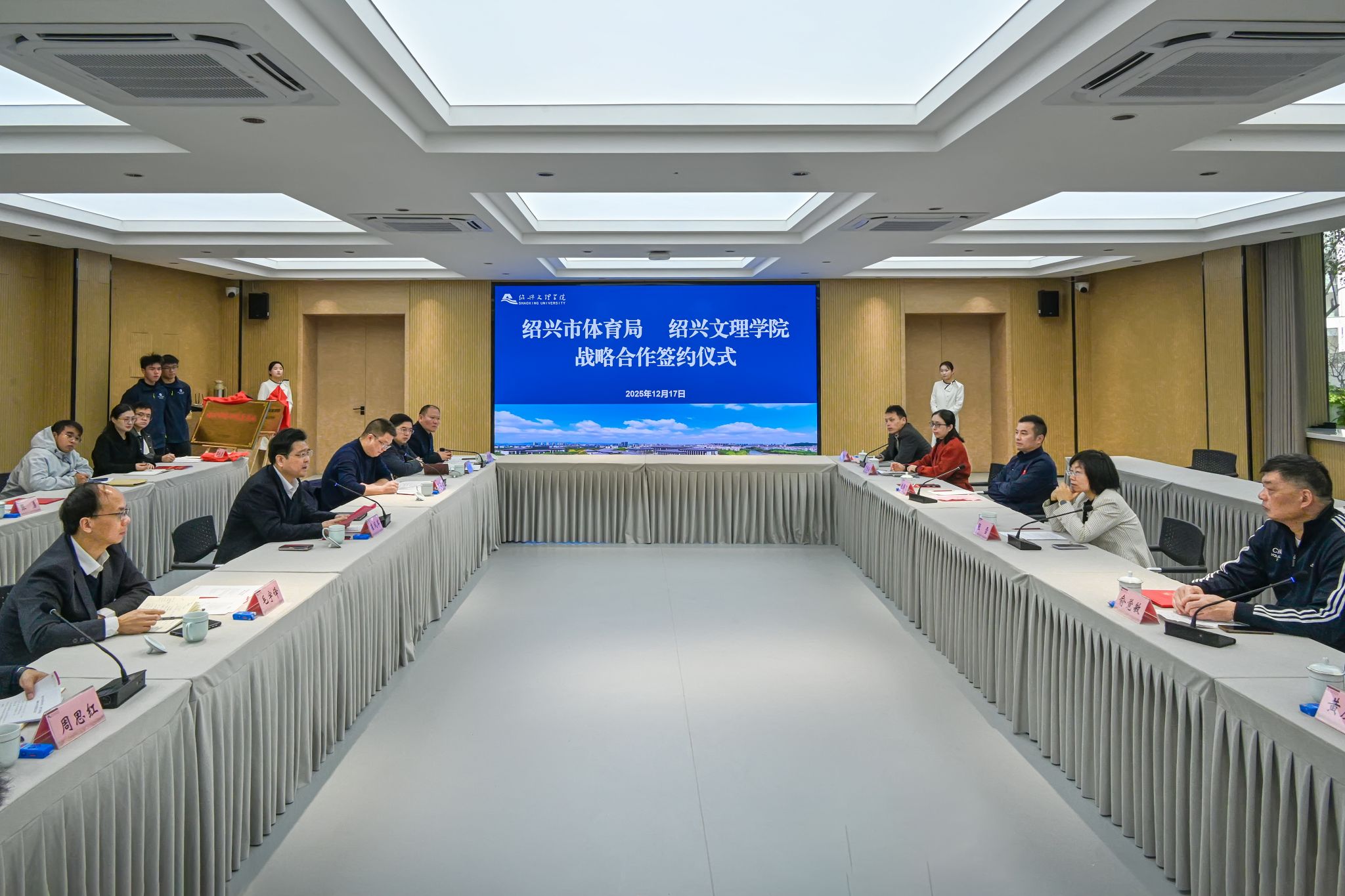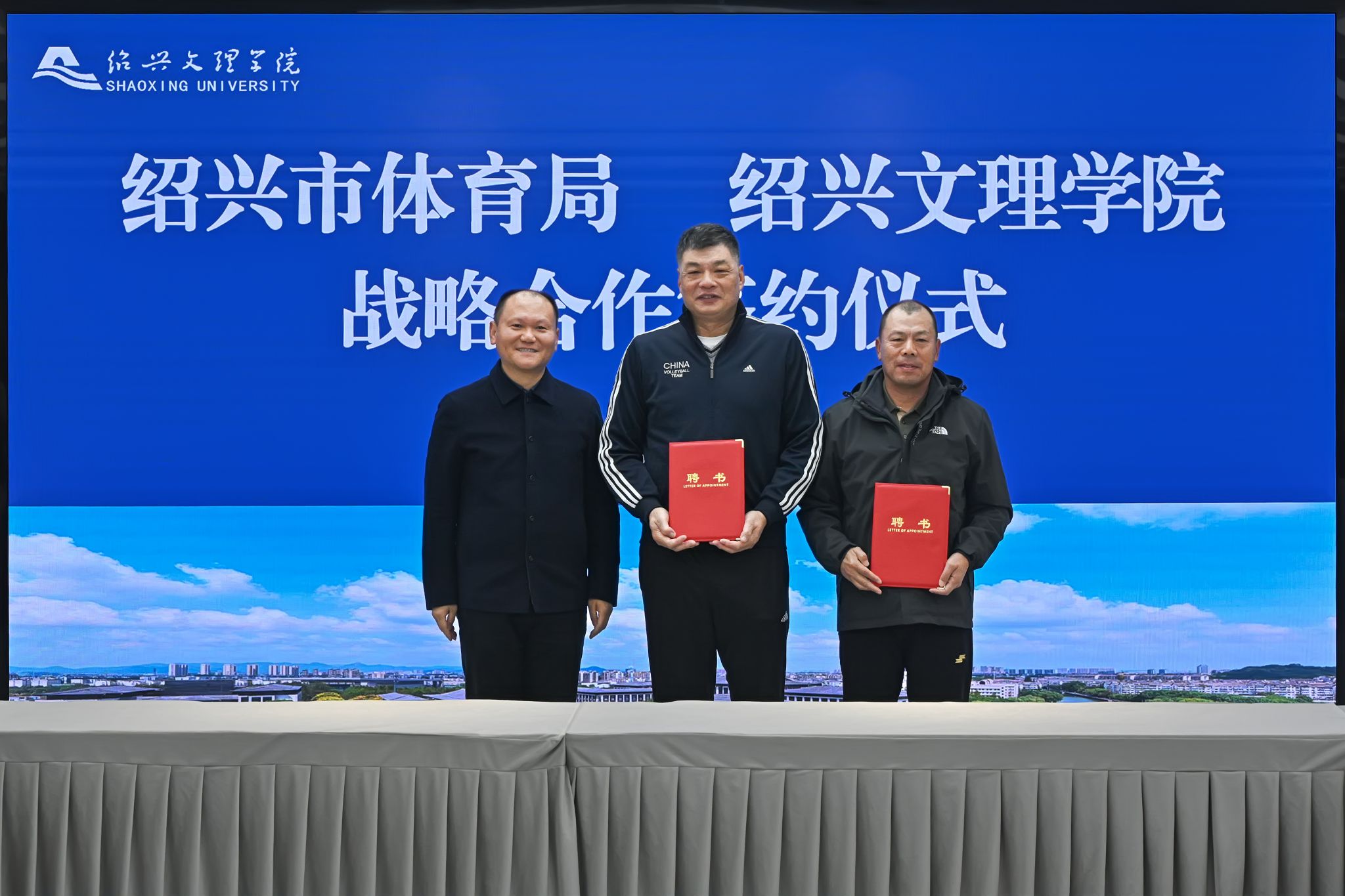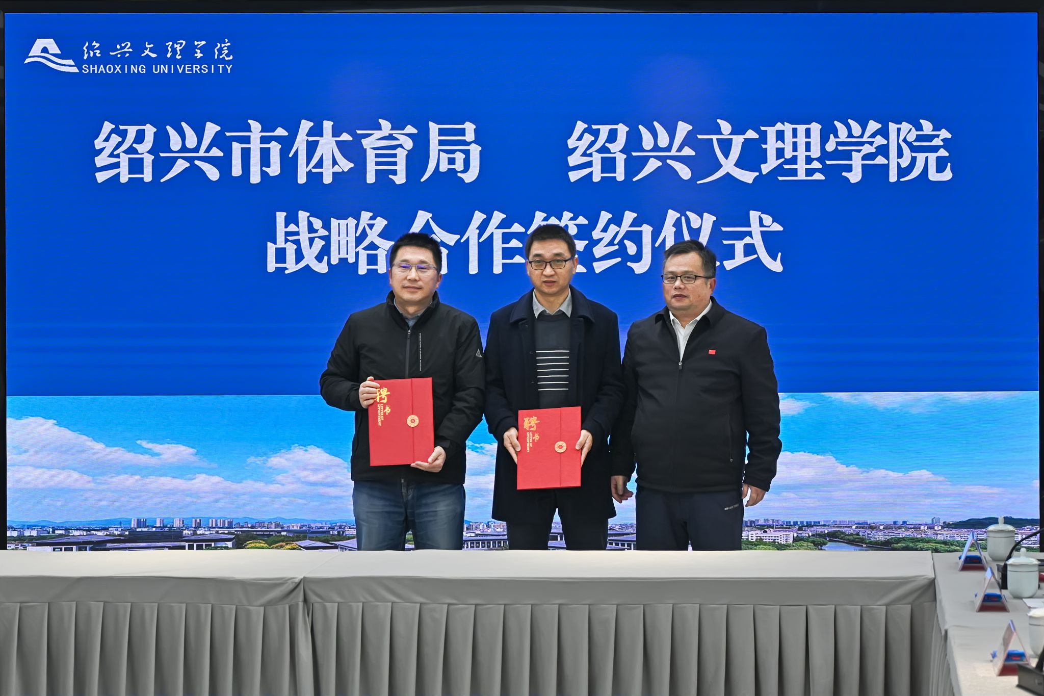 陈均土和赵腾飞分别代表绍兴文理学院和绍兴市体育局签订战略合作协议,张雪和崔凤军见证协议签署。