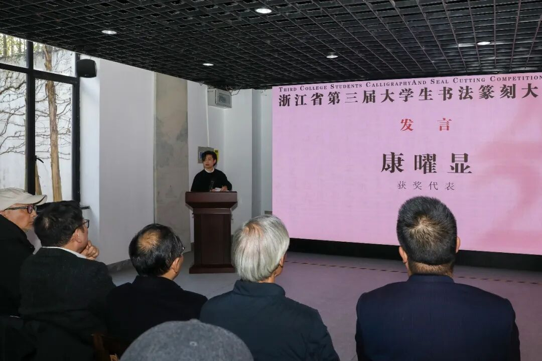 获奖学生代表、兰亭书法艺术学院研究生康曜显发表感言。