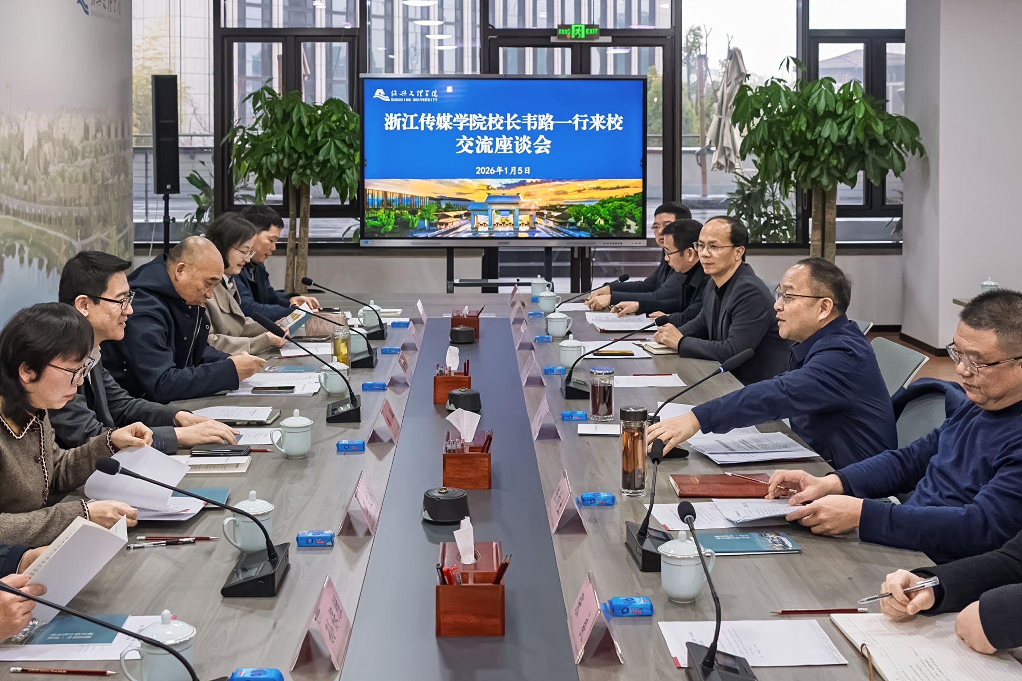 1月5日,浙江传媒学院校长韦路,党委副书记徐伟标,副校长李文冰、姜雯,党委委员、宣传部部长孙保胜来访我校。校党委书记崔凤军热情接待,校长赵阳,副校长陈均土,校党委委员、组织部部长黄曼出席座谈会。