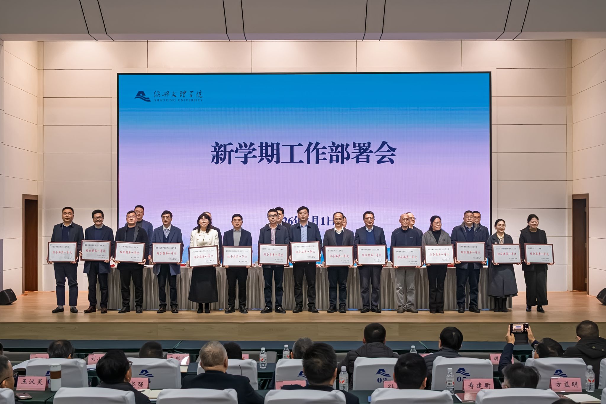 新学期工作部署会上,崔凤军简要回顾了学校寒假期间各项工作及成效,重点传达了省市“新春第一会”精神。他指出,省市“新春第一会”和全省教育系统工作会议传递的核心信号,就是“开局即决战、起步即冲刺”,这种只争朝夕、克难攻坚的奋斗姿态,正是我们当前最需要践行的精神品质。2026年是实施“十五五”发展规划、高质量建设绍兴大学的开局之年,是冲刺博士学位授予单位、实现办学层次跃升的决胜之年。要聚焦核心任务,攻坚突破进位,以实干实绩推动事业跃升,着力抓好八项重点工作:高标准制定实施“十五五”发展规划,全面启动“博士学位授予单位”攻坚行动,全力以赴争取“优质特色应用型本科院校和学科专业”建设资格,大力加强学科专业布局优化调整,扎实推进国家级教学成果奖申报工作,高质量完成教育评价改革国家试点工作,全面启动校地共生“双百工程”,守牢安全底线红线护航事业发展。