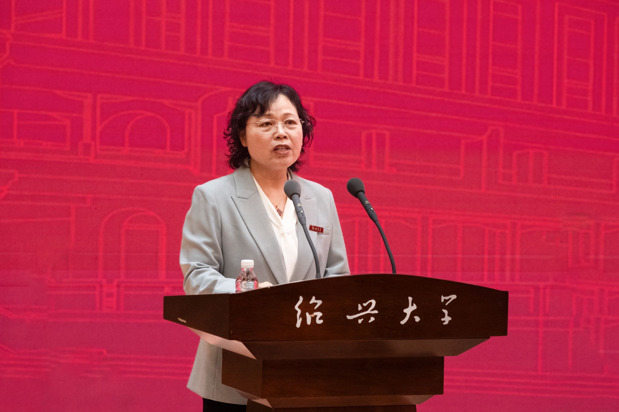 获奖教师代表施丽莲发言,回顾从教三十载、亲历并见证学校升格为绍兴大学的历程,表示将把荣誉化为责任、把感激化为动力,不断更新教育理念、提升教学能力,助力更多青年学子成长成才。