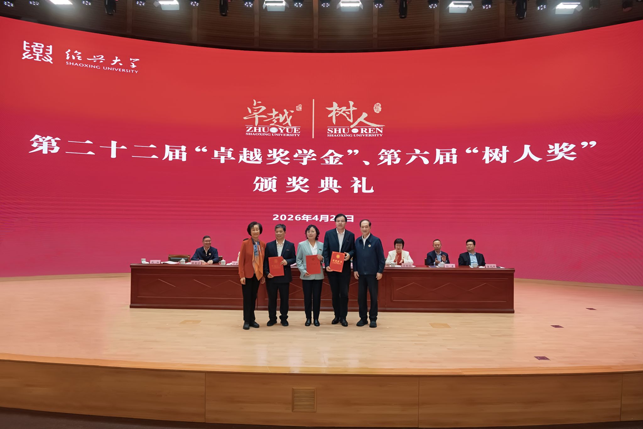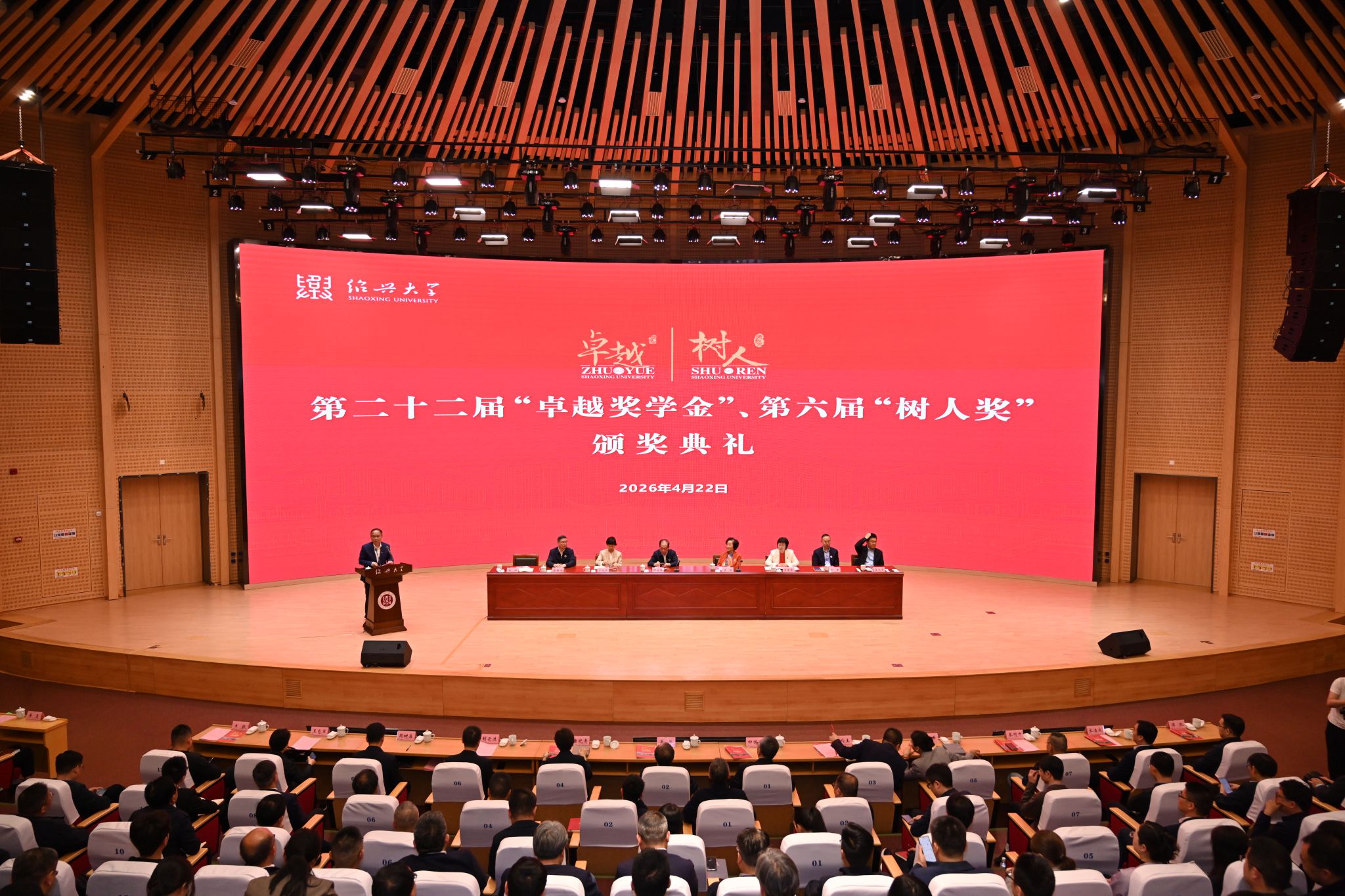 四月的校园,春和景明,万物向新。4月22日上午,绍兴大学第二十二届“卓越奖学金”、第六届“树人奖”颁奖典礼隆重举行。“卓越奖学基金”“树人奖教基金”倡设者、第十二届全国政协副主席、中国科协名誉主席、中国科学院韩启德院士,北京大学燕京学堂名誉院长、北京大学国际关系学院袁明教授出席颁奖典礼并为获奖师生颁奖。省政协副秘书长、九三学社省委会专职副主委、一级巡视员丁晓燕,市长吴登芬,市政协党组书记、主席张新宇,副市长孙君,校党委书记崔凤军,校长赵阳出席颁奖典礼并在主席台就座。