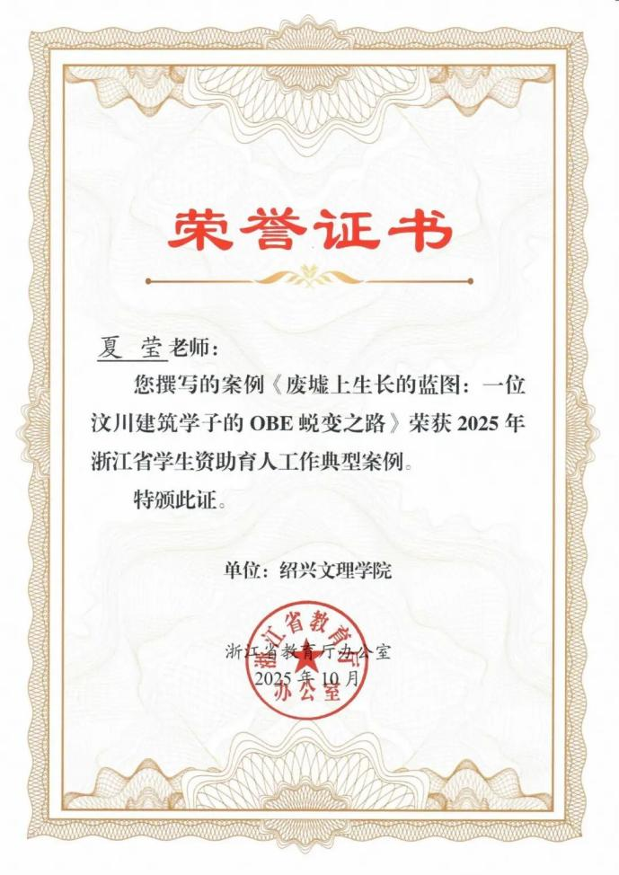 在“学生资助育人工作典型案例”评选中,我校夏莹老师撰写的《废墟上生长的蓝图:一位汶川建筑学子的OBE蜕变之路》深情记述资助育人真实历程,成功入选省级典型案例名单。