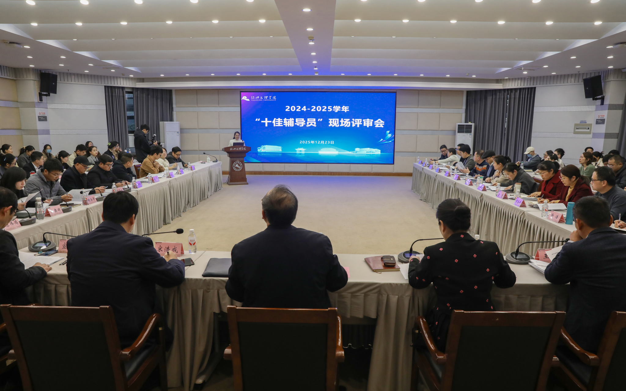 12月23日,校2024-2025学年“十佳辅导员”现场评审会在图书馆报告厅举行。校党委副书记黄坚,党委委员、宣传部部长宋浩成出席活动,相关职能部门负责人、二级学院书记和副书记担任评委,全体辅导员现场观摩。