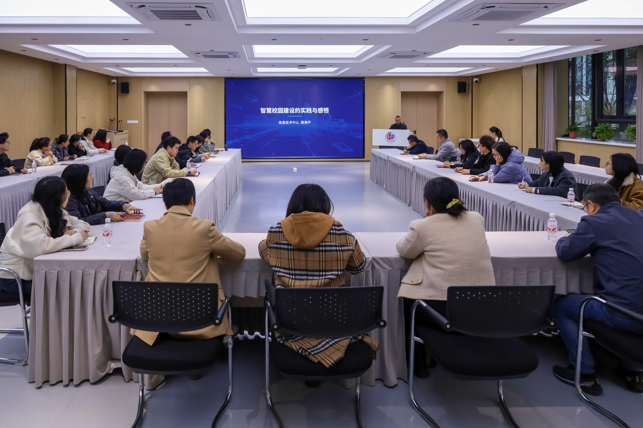 周海平从日常场景切入。他坦言,很多老师可能只感受到“账号打通了”“审批不用跑腿了”,但背后其实是一整套体系在支撑。他从时代背景与建设目标、智慧校园建设实践、建设体会与反思、未来展望与规划四个维度,把学校这些年“看不见的功夫”一一摊开。