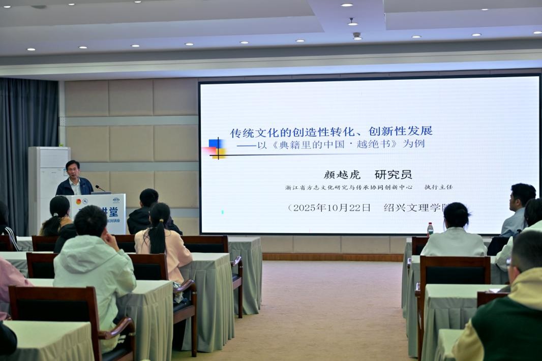 10月22日晚,浙江省方志文化研究与传承协同创新中心执行主任、《浙江通志》副总纂颜越虎做客青春讲堂“青年与城市共成长”系列讲座第十二讲,以“传统文化的创造性转化、创新性发展——以《典籍里的中国·越绝书》为例”为题,为师生带来一场思想深刻、富有文化温度的分享。