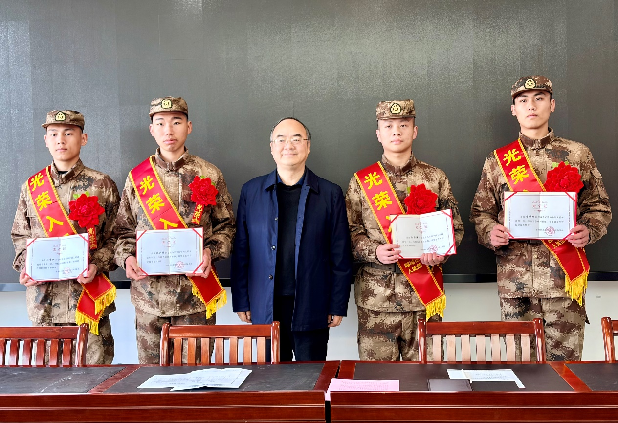 黄坚向光荣入伍的同学们表示热烈祝贺,并为每一名新兵颁发入伍光荣证和纪念品。他勉励同学们把“修德求真”的校训融入军魂,做听党指挥的忠诚战士;把“追求卓越”的劲头融入训练,做本领过硬的优秀标兵。他深情嘱托,学校永远是你们的坚强后盾,母校老师时刻关心着你们的成长,盼着你们捷报频传。