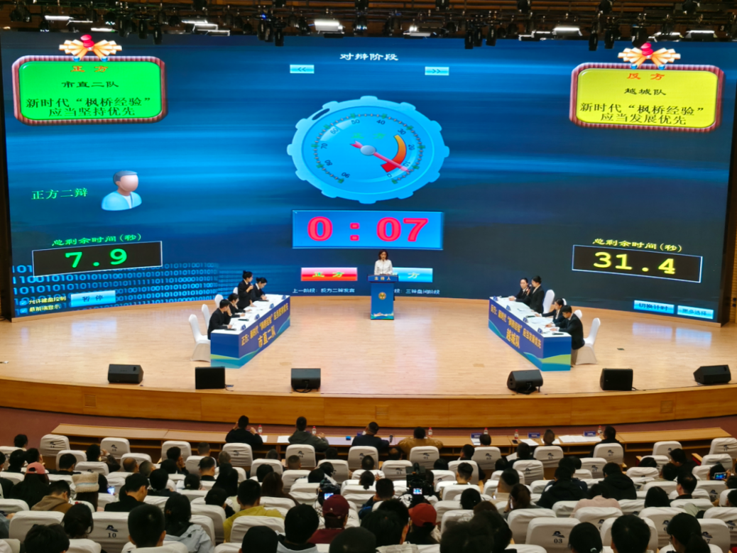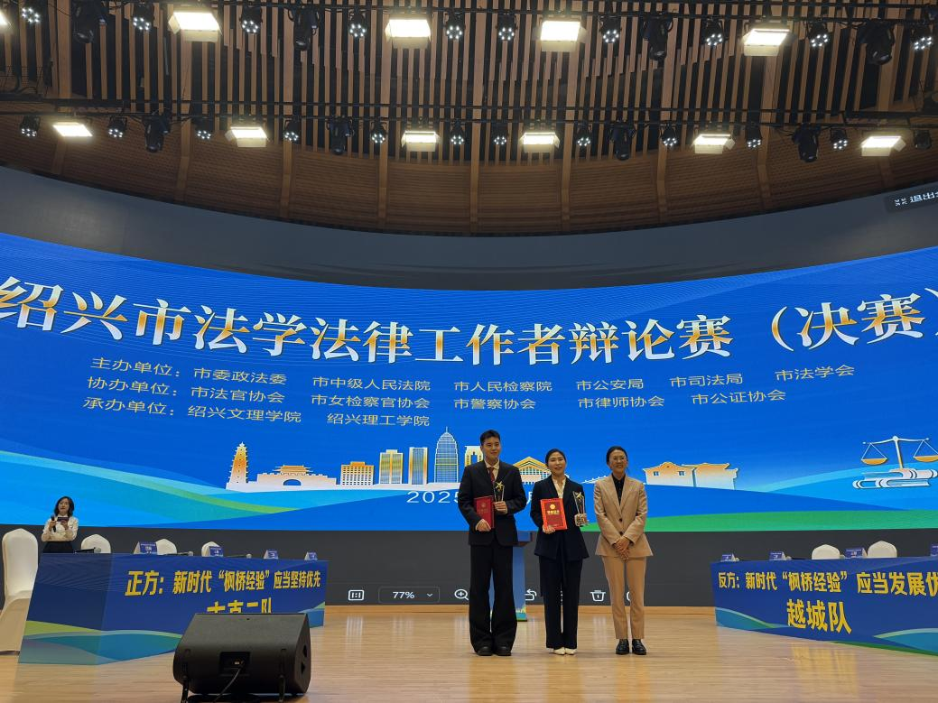 11月17日晚,2025年绍兴市法学法律工作者辩论赛决赛在绍兴文理学院风则江大讲堂举行。决赛辩题是新时代“枫桥经验”应当坚持优先还是发展优先。市委副书记、政法委书记、市法学会会长王涛、绍兴文理学院副校长赵浪平出席活动并为获奖选手颁奖。商学院党委书记、法律系教师和学生代表参与活动。