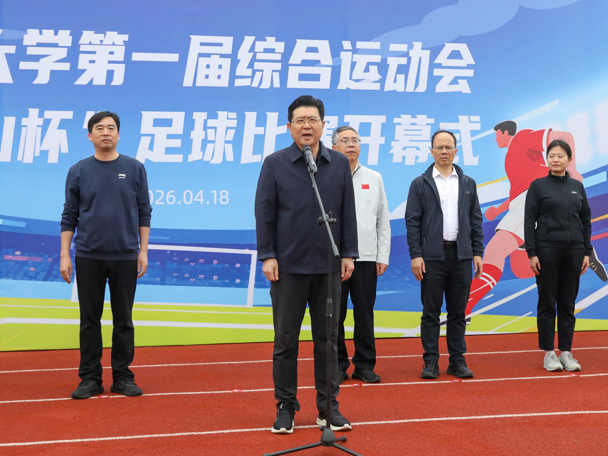 4月18日上午,绍兴大学第一届综合运动会“龙山杯”足球比赛开幕式在河西体育中心足球场举行。校党委书记崔凤军,副校长柳国庆,校党委委员、宣传部部长宋浩成等出席开幕式,崔凤军宣布比赛开幕,柳国庆为揭幕战开球。