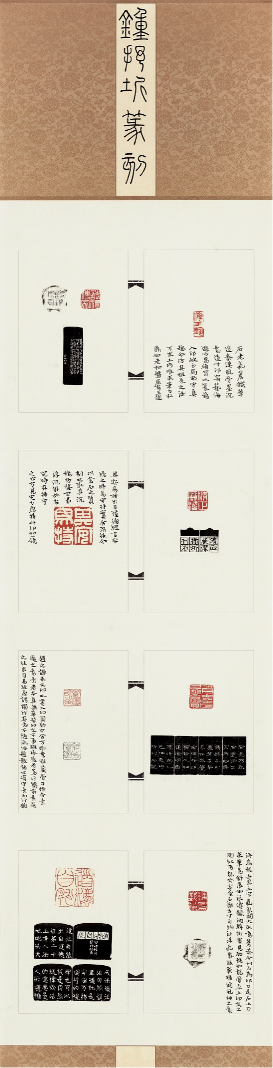 作品介绍:该印屏内容较为丰富,有以吴昌硕典型粗朱文风格的游于艺,也有赵之谦风格的朱文印,在白文印的创作中主要选择了以汉印为基,“清正廉洁”这方印在处理上加入了吴昌硕的典型风格,让此印看起来更为的古朴、苍劲。在创作过程中努力追求传统与个性的传统维度,并在有些印旁用魏晋小楷进行标注说明,增加了整个印评的丰富程度。