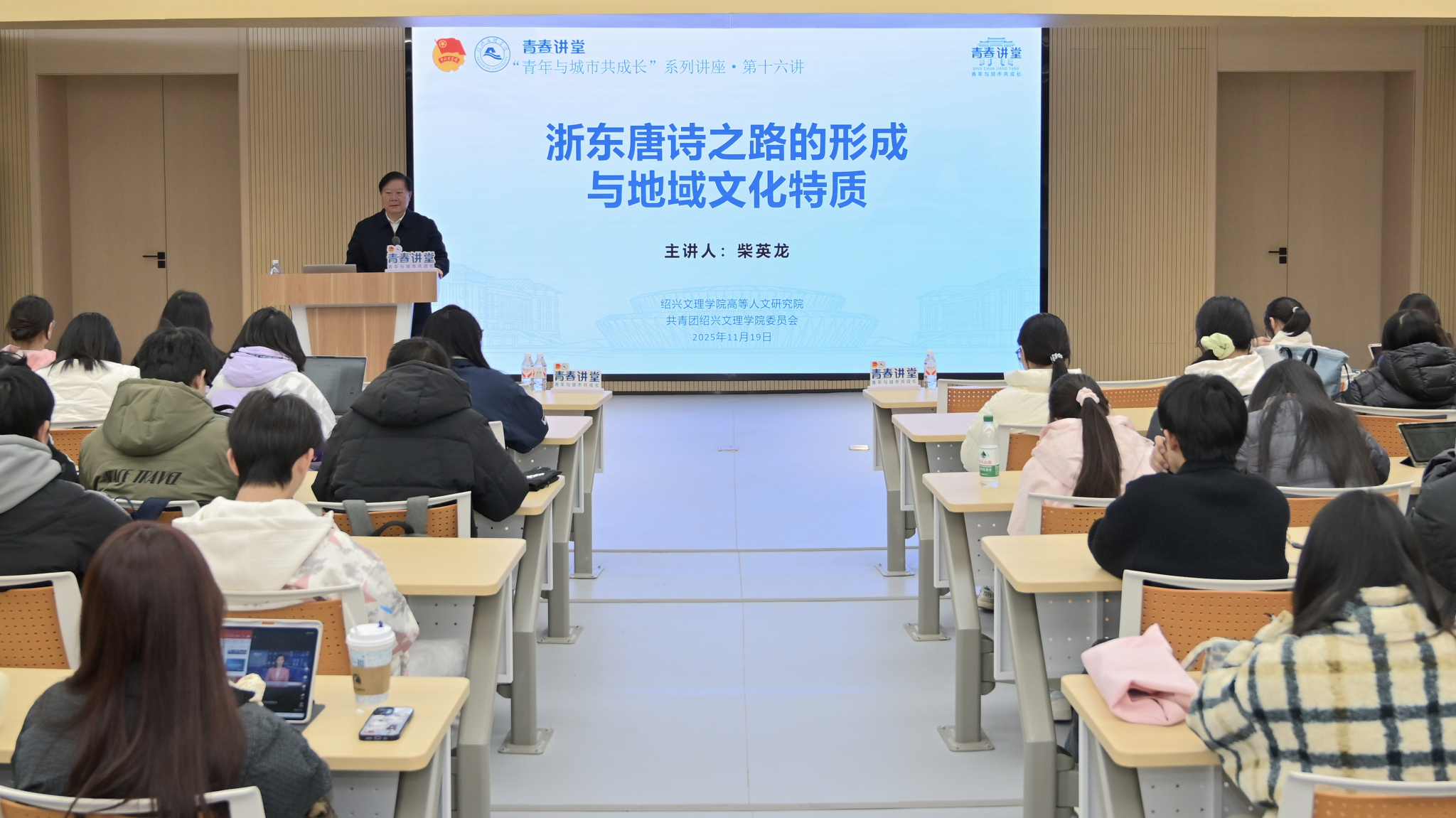 11月19日晚,青春讲堂之“青年与城市共成长”系列讲座迎来第十六讲,绍兴市政协二级巡视员、绍兴浙东运河文化研究中心主任、绍兴市鉴湖文化研究会常务副会长柴英龙讲述《浙东唐诗之路的形成与地域文化特质》,结合绍兴文史与鉴湖文化,解析这条诗歌文化带的源流与当代价值,揭示地域文化与城市发展的深刻联结。