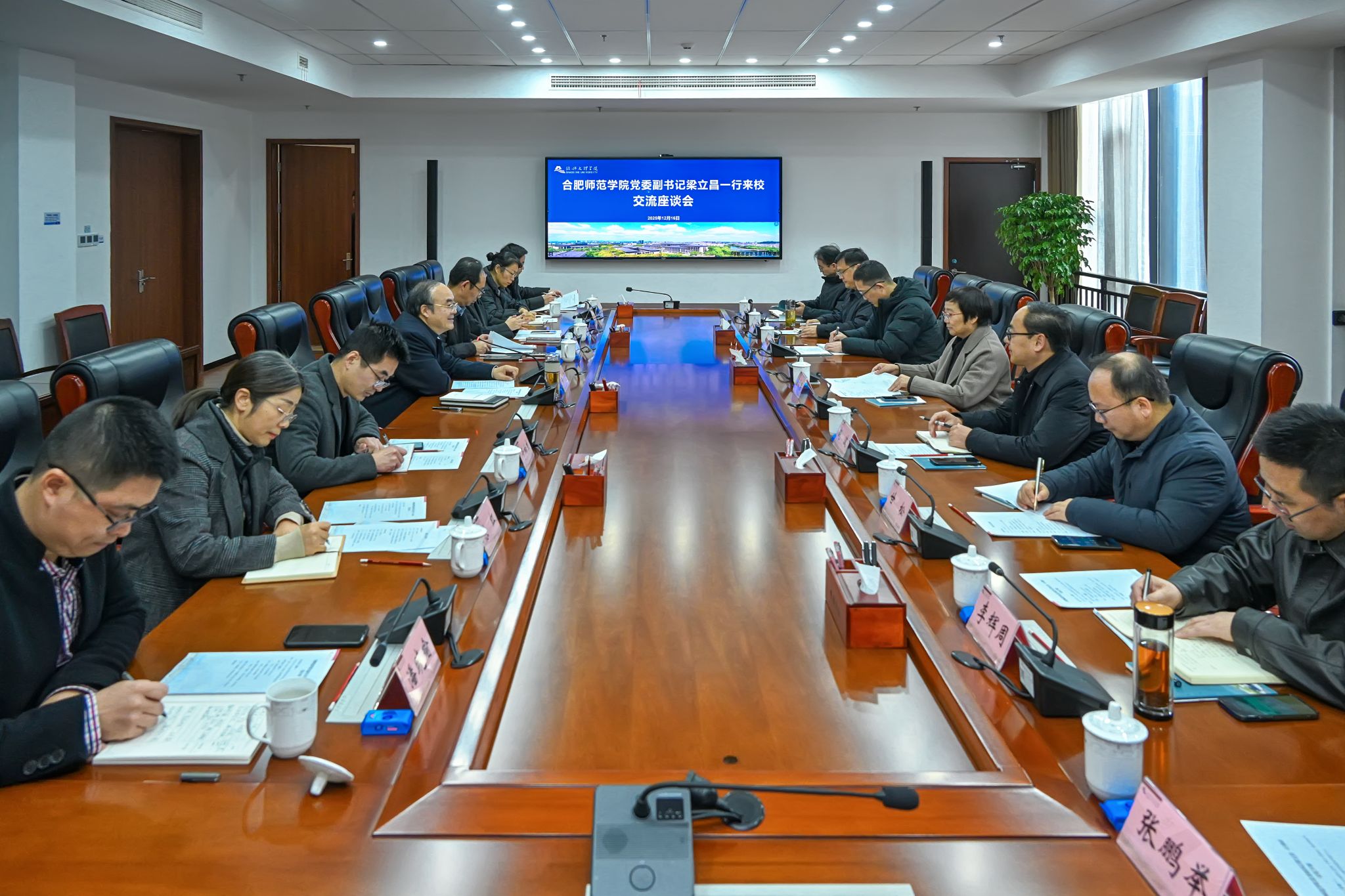12月16日上午,合肥师范学院党委副书记梁立昌一行来校交流座谈。校党委副书记黄坚热情接待,组织部、学生处、鲁迅人文学院、马克思主义学院、外国语学院、蔡元培艺术与设计学院相关负责人参加座谈。