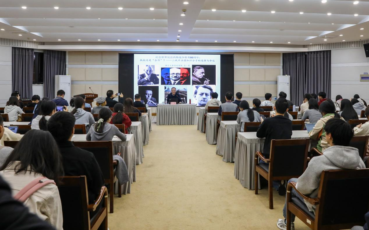 10月23日晚,图书馆一楼报告厅座无虚席,浙江大学历史学院教授、浙江大学公众史学研究中心主任、中国法国史研究会副会长吕一民应邀做客风则江大讲堂第380讲,作题为“纪念世界反法西斯战争胜利80周年:抵抗还是‘合作’?法国知识分子二战中的不同选择与命运”的专题讲座。马克思主义学院院长杜坤林主持讲座。