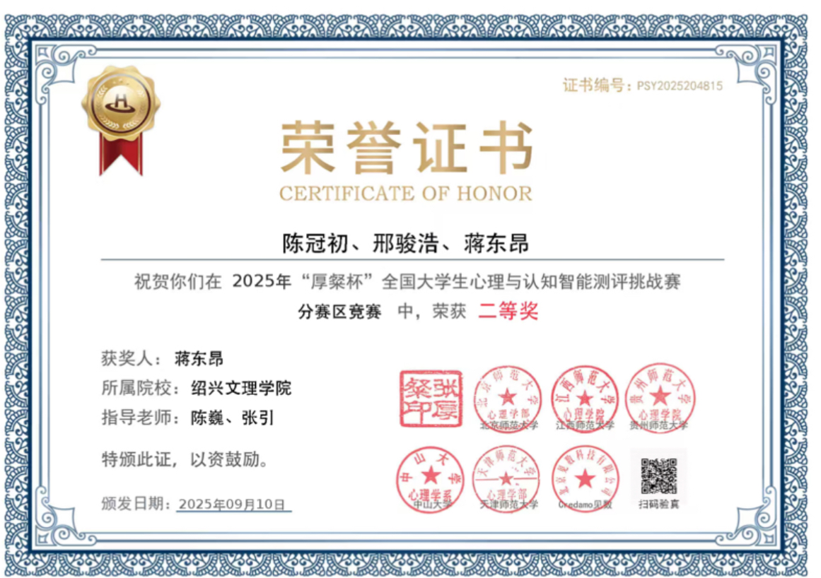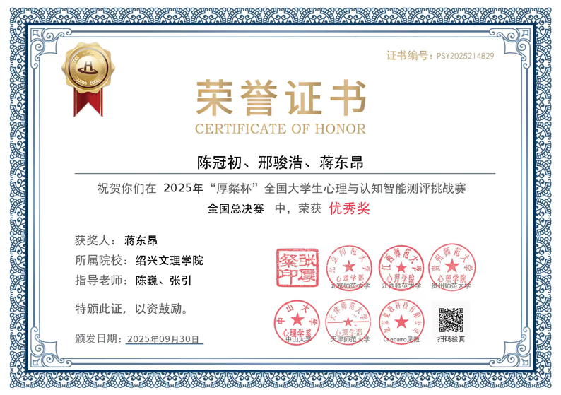 近日,首届“厚粲杯”全国大学生心理与认知智能测评挑战赛全国总决赛成绩揭晓,我校教育与心理学院应用心理学221班陈冠初带领的团队(成员:陈冠初、邢骏浩、蒋东昂,指导老师:陈巍、张引)从全国晋级队伍中脱颖而出,获全国优秀奖。