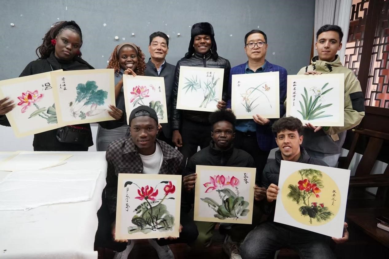 在杨馆长的现场指导下,留学生们纷纷提笔蘸墨,亲身体验水墨交融的意趣与韵味。活动尾声,留学生代表将亲手绘制的画作赠予我院教师,以表达对学院的感谢之情。