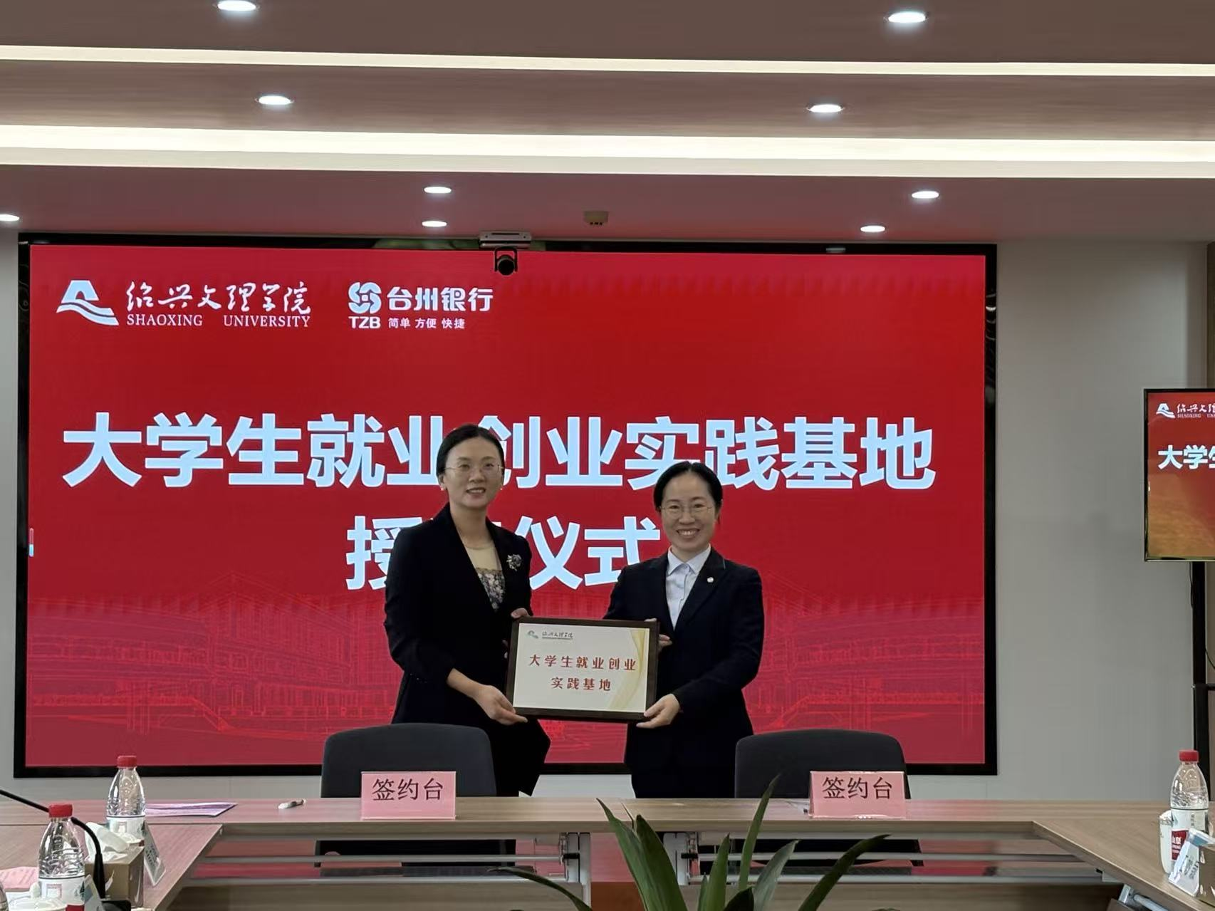 活动伊始,赵浪平向分行授予“大学生就业创业实践基地”牌匾,商学院党委书记徐青与台州银行绍兴分行行长戴霞飞共同签署合作协议。