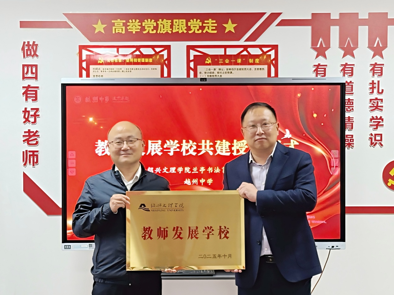 10月27日,兰亭书法艺术学院党委书记孙仕龙、教育实习指导老师丁诗薇赴越州中学举行“教师发展学校”共建授牌仪式并听课。越州中学党委书记宣方军,党委副书记、校长余文浩共同出席仪式。