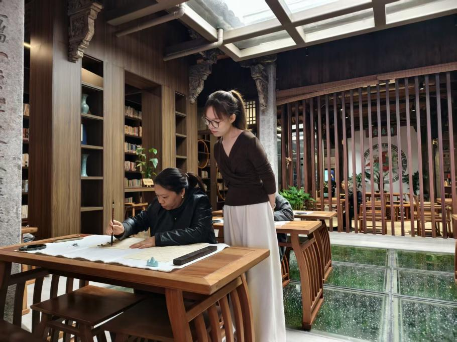 10月30日上午,活动在明善书院进行,凌天明为松阳县实验小学的教师们讲解汉字结构特点与书写要领,并组织大家亲身体验毛笔书法。