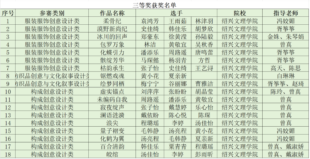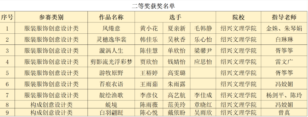 近日,2025“Style3D杯”第九届浙江省大学生服装服饰创意大赛圆满落幕。我校蔡元培艺术与设计学院学子表现优异,共斩获28个奖项:一等奖1组(金奖,选送全国赛)、二等奖9组、三等奖18组。具体获奖名单如下: