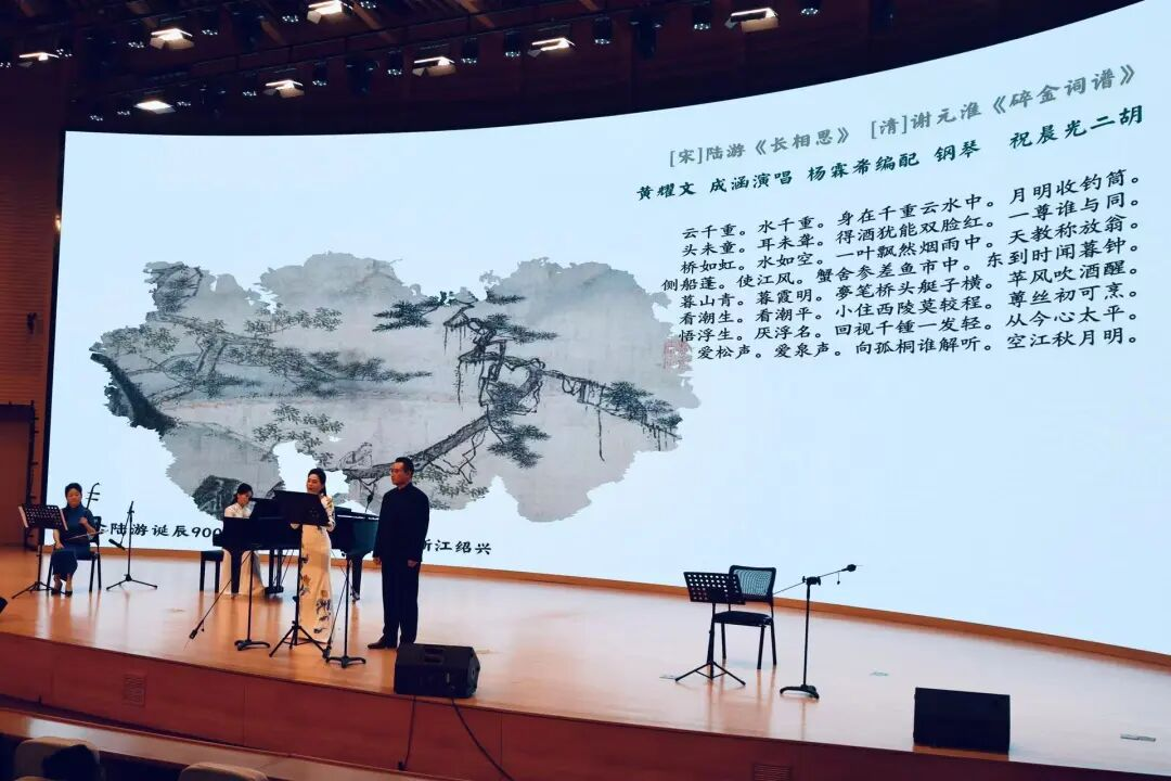 音乐会上,师生共同演绎15首宋代古谱诗词歌曲。浙江省朗诵协会理事、前江苏广电总台电视节目主持人赵承安担任主持,王洪涛、郭小青、邓静、王菁菁、黄耀文、成涵、董方七位老师主唱,杨霖希、唐颖、祝晨光、周仕、龙茜、利家明、颜圆师生伴奏。没有高亢炫技,不见跌宕转折,几道旋律如宋代词牌般平仄相携,明暗相交,在钢琴与二胡、竹笛、古筝、琵琶、洞萧的悠扬交织中缓缓铺陈。耳畔似能听见近千年前陆游诗词的现实主义与浪漫主义的融合、雄浑豪放与清新自然并存的艺术风格,那些藏在典籍里的风雅与情思,借由新生的古音重新鲜活,使经典诗词在意境与韵律的完美融合中次第绽放。