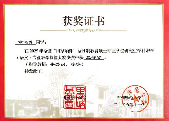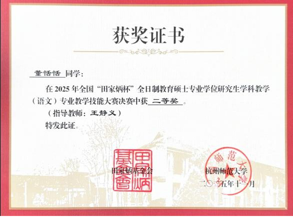 在2025全国田家炳杯全日制教育硕士专业学位研究生学科教学(语文)专业教学技能大赛决赛中,鲁迅人文学院教育2304班董恬恬获二等奖,教育2304班章逸菁获三等奖。