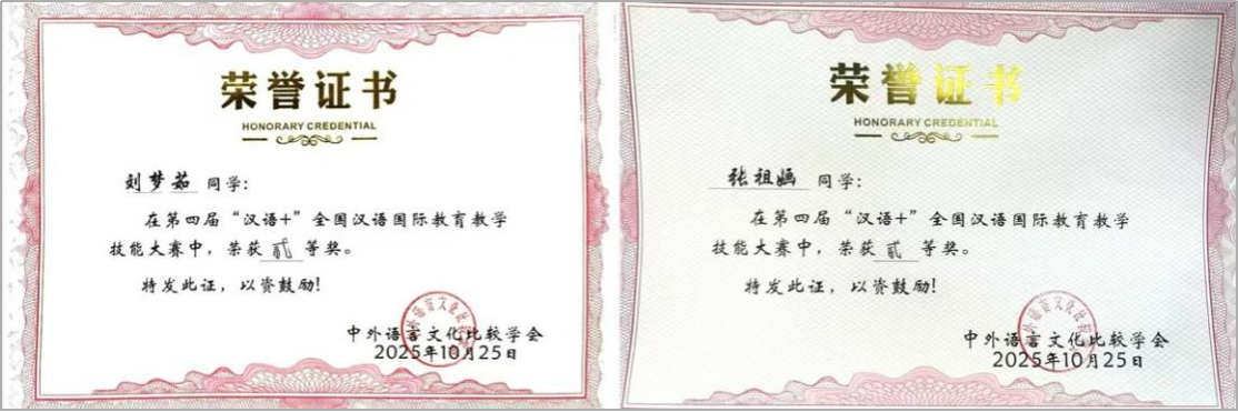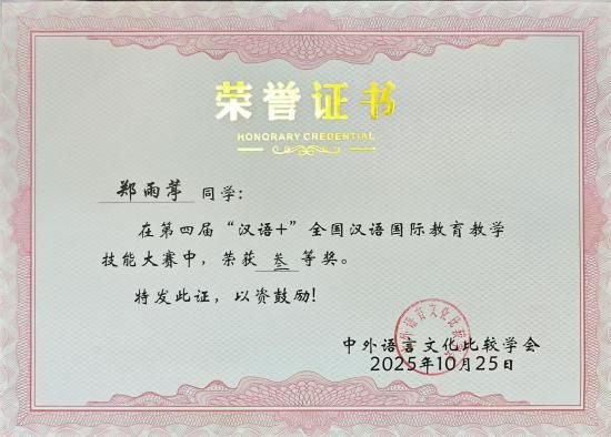 在第四届“汉语+”全国汉语国际教育教学技能大赛中,汉语国际教育2301刘梦茹、国际中文2501班张祖婳荣获二等奖,国际中文教育2401班郑雨葶获三等奖;在2025年江苏省研究生科研创新实践大赛之汉语国际教学技能大赛暨中华才艺大赛中,国际中文2401班王懿获得教学技能类(中国学生组)特等奖,国际中文2501班张祖婳获教学技能类(中国学生组)二等奖,国际中文2401班刁倩怡与国际中文2501班张紫燃、张祖婳、嵇浩组成的团队获中华才艺类二等奖。