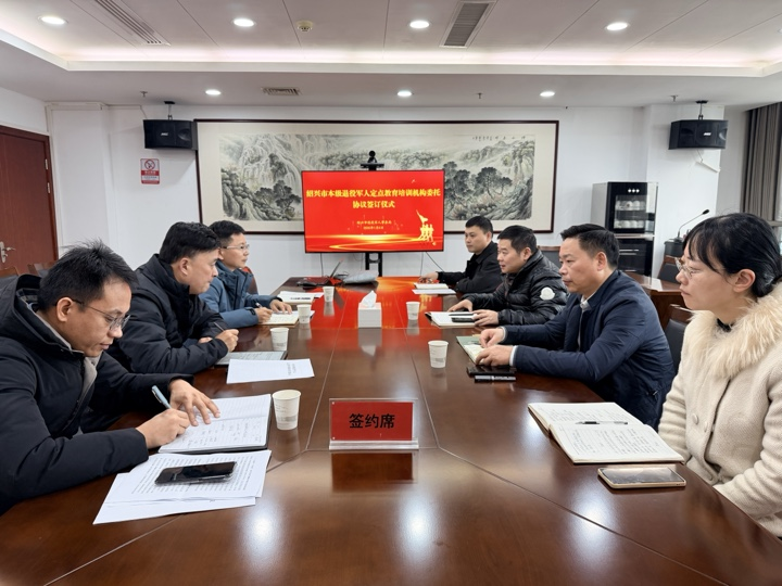 1月6日上午,我校与绍兴市退役军人事务局签订定点教育培训机构委托协议。经严格评审,我校首次被认定为绍兴市退役军人事务局指定的定点教育培训机构。绍兴市退役军人事务局党组成员、副局长戴元照,学校继续教育学院院长单磊,绍兴市退役军人事务局移交安置处与军休服务管理处处长章友春以及相关定点培训机构负责人参加签约仪式。