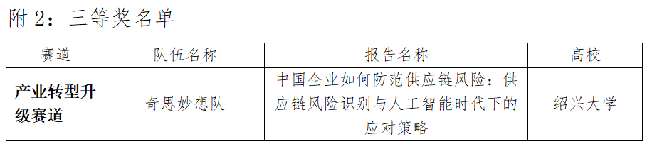 商学院(法学院)参赛队选择了产业转型升级赛道,紧扣国际经贸领域热点问题,结合行业发展前沿,系统分析了复杂国际环境下企业供应链风险防范的路径与策略。参赛作品数据详实、论证严谨,充分展现了学生扎实的专业基础和较强的研究能力,最终荣获全国三等奖。
