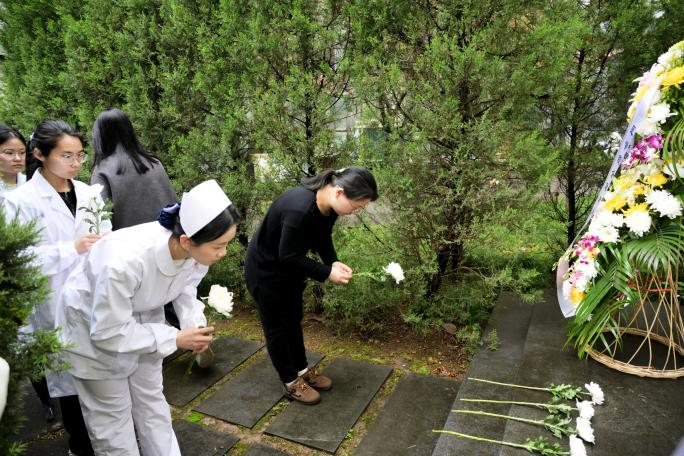 仪式结束后,师生们手持素菊依次献于碑前。此次跨越生死的对话,不仅是一场哀思的寄托,更是一堂生动的生命教育课,激励着绍医学子传承薪火,以仁心仁术回报社会。