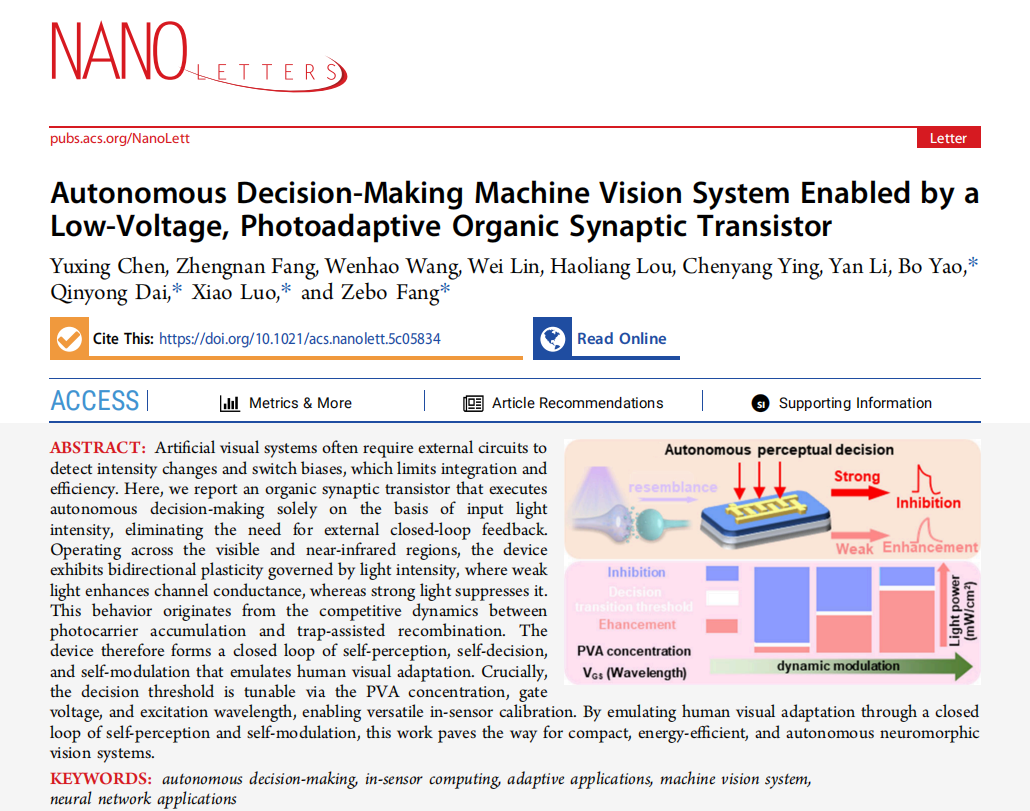 近日,数理信息学院微机电系统浙江省工程研究中心神经形态器件团队在纳米科学与技术领域国际顶级期刊Nano Letters (自然指数(NI)期刊,中科院一区TOP,IF:9.1)上发表了一项最新突破性成果。团队受生物视觉系统启发,成功制备了具有自主感知决策能力的有机突触晶体管。该器件通过感知光强变化,自主响应增强/抑制信号转变并通过调节波长、栅介质浓度等参数实现了器件决策阈值的实施调控。数理信息学院物理学集成电路器件物理与工程专业2023级研究生陈禹行为该论文的第一作者,微机电系统浙江省工程研究中心姚博教授、方泽波教授、青年教师戴钦镛为本论文的通讯作者,电子科技大学电子薄膜与集成器件国家重点实验室罗消教授为本论文的共同通信作者。