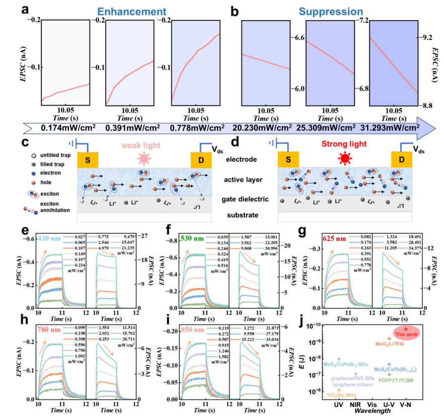 该器件在可见光至近红外范围内均表现出稳定的响应特性,并呈现出由光强调控的双向突触可塑性。即弱光条件下沟道电导增强,而强光条件下则受到抑制。这一行为源于光生激子淬灭与陷阱捕获之间的竞争动力学。通过这种机制,器件能够形成“自感知—自决策—自调控”的闭环过程,从而模拟人类视觉系统的自适应能力。此外,通过调节PVA浓度、栅极电压及激发波长,可以灵活调控器件的决策阈值,实现多场景下的原位传感与计算。该研究为构建紧凑、低功耗且具备自主决策能力的神经形态机器视觉系统提供了一种新的实现策略。