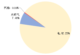 2021年第一季度能源消耗中主要能源指标消耗情况如下:电消耗量为3642624kWh(447678.49tce),占能源消耗总量的92.25%;天然气消耗量为24411.67m3(35919.33tce),占能源消耗总量的7.40%;汽油消耗量为1155.56L(1700.29 tce),占能源消耗总量的0.35%(具体占比见下表)。