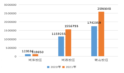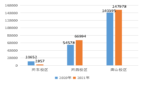 2021年第三季度河东校区耗电量119650kwh,较2021年第二季度增加1494kwh,环比增加1.26%,比2020年第三季度下降3886kwh,同比下降3.15%;河西校区耗电量1556793kwh,较2021年第二季度增加5490kwh,环比增加0.35%,比2020年第三季度增加397538kwh,同比增加34.29%;南山校区耗电量2590648kwh,较2021年第二季度增加198671kwh,环比增加8.31%,比2020年第三季度增加848289kwh,同比增加48.69%(具体详见图3-1)。