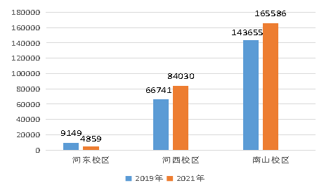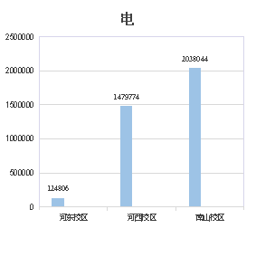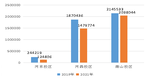 2021年第一季度河东校区耗电量124806kwh,比2019年第一季度下降119413kwh,同比下降48.90%;河西校区耗电量1479774kwh,比2019年第一季度下降390662kwh,同比下降20.89%;南山校区耗电量2038044kwh,比2019年第一季度下降107489kwh,同比下降5.01%(具体详见图3-1)。