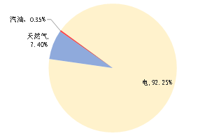 2021年第一季度能源消耗中主要能源指标消耗情况如下:电消耗量为3642624kWh(447678.49tce),占能源消耗总量的92.25%;天然气消耗量为24411.67m³(35919.33tce),占能源消耗总量的7.40%;汽油消耗量为1155.56L(1700.29 tce),占能源消耗总量的0.35%(具体占比见下表)。
