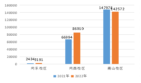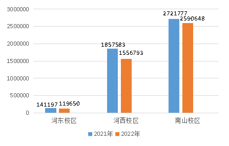 2022年第三季度河东校区耗电量141197kwh,较2022年第二季度下降6297kwh,环比下降4.27%,比2021年第三季度增长21547kwh,同比增加18.01%;河西校区耗电量1857583kwh,较2022年第二季度下降2023kwh,环比下降0.11%,比2021年第三季度增加300790kwh,同比增加19.32%;南山校区耗电量2721777kwh,较2022年第二季度增加144694kwh,环比增加5.61%,比2021年第三季度增加131129kwh,同比增加5.06%(具体详见图3-1)。