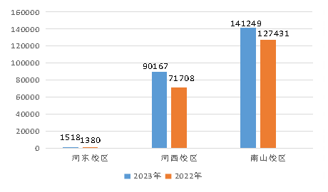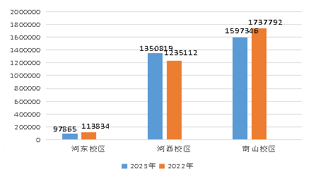 2023年第一季度河东校区耗电量97865kwh,较2022年第四季度下降40781kwh,环比下降29.41%,比2022年第一季度下降15969862kwh,同比下降14.03%;河西校区耗电量1350819kwh,较2022年第四季度下降595567kwh,环比下降30.60%,比2022年第一季度增加115707kwh,同比增加9.37%;南山校区耗电量1597346kwh,较2022年第四季度下降960188kwh,环比下降37.54%,比2022年第一季度下降140446kwh,同比下降8.08%(具体详见图3-1)。
