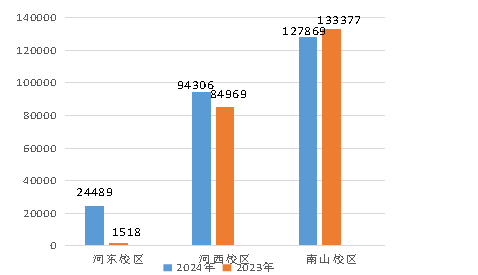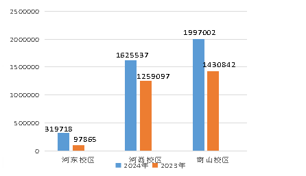 2024年第一季度河东校区耗电量319718kwh,较2023年第四季度下降36339kwh,环比下降10.21%,比2023年第一季度上升221853kwh,同比上升226.69%;河西校区耗电量1625537kwh,较2023年第四季度下降273948kwh,环比下降14.42%,比2023年第一季度上升366440kwh,同比上升29.10%;南山校区耗电量1997002kwh,较2023年第四季度下降456917kwh,环比下降18.62%,比2023年第一季度上升566160kwh,同比上升39.57%(具体详见图3-1)。原因分析,河东校区新投入使用5幢学生公寓,另一方面是空调投入使用的比例也在增长 ,这也是导致用电量增长的原因之一。