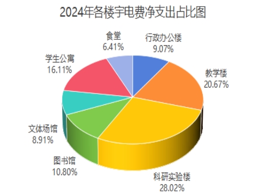 针对全年电费净支出的情况,按行政办公楼、教学楼、科研实验楼、图书馆、文体场馆、学生公寓以及食堂七个主要的楼宇类别具体深入分析,2024年各类楼宇电费支出7569201元,同比2023年增加1569310元,其中学生公寓的电费支出增量明显(详见下表)。