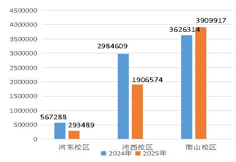 河西校区2025年第四季度耗水量82313m³,比2025年第三季度减少23516m³,环比下降22.22%,比2024年第四季度减少48441m³,同比下降37.05%。原因分析:河西5-15幢公寓学生9月初全体搬迁至南山校区导致该区域用水量减少。